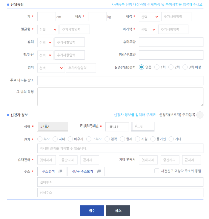 해당 메뉴를 클릭하게 되면, 아래와 같읕 절차를 통해 사전 신청을 할 수 있습니다. 사전등록 신청 후 본인확인 절차를 거치고 나면 사전등록 대상자에 대한 기본 정보와 신체 특징, 그리고 보호자에 대한 상세 정보를 입력해야 합니다. 이 과정을 거쳐 최종 접수 신청하고, 가까운 지구대에 방문 후 지문등록까지 마치면 완료됩니다.