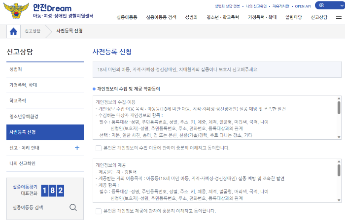사전등록 신청 안내 아동·여성·장애인 경찰지원 센터에서는 아동등의 실종을 방지하고 실종발생 시 신속한 발견을 위해서 사전등록제를 운영하고 있습니다. 신청하러 가기