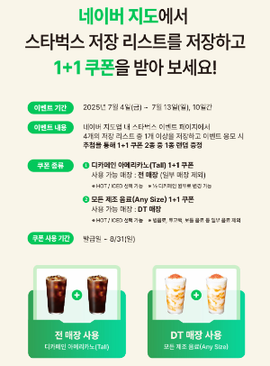 스타벅스 1+1 쿠폰을 받을 수 있는 이번 스타벅스 네이버지도 이벤트는 커피를 즐기며 네이버지도 앱도 유용하게 활용할 수 있는 기회입니다. 짧은 기간 동안 진행되니, 지금 바로 응모해 보세요!