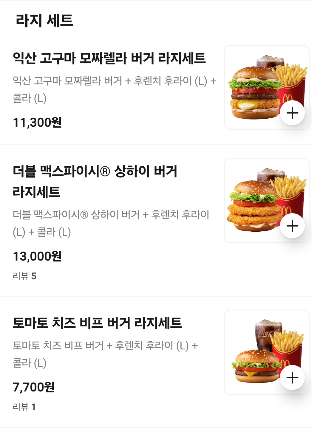 | 익산 고구마 모짜렐라 버거 | 고구마 크로켓 + 모짜렐라 + 소스 | 약 7,900원 | 약 9,200원 |