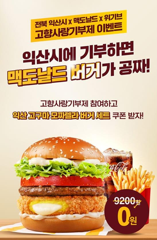 현재 익산시는 한국맥도날드의 '익산 고구마 모짜렐라 버거' 출시 기념으로, 고향사랑기부제 참여자를 대상으로 한 이벤트를 진행한다고 10일 밝혔습니다. '고향사랑이(e) 음'과 민간플랫폼 '위기브'를 통해 익산시에 10만 원 이상 기부하면 9200원 상당의 익산 고구마 모짜렐라 버거 세트 모바일 쿠폰을 증정합니다. 이와 함께 이벤트 기간 익산시 고향사랑기부제에 10만원을 기부하면 세액공제 100% 혜택과 3만 원 상당의 익산시 답례품과 고구마 버거 쿠폰까지 총 13만 9200원의 혜택을 받을 수 있습니다.