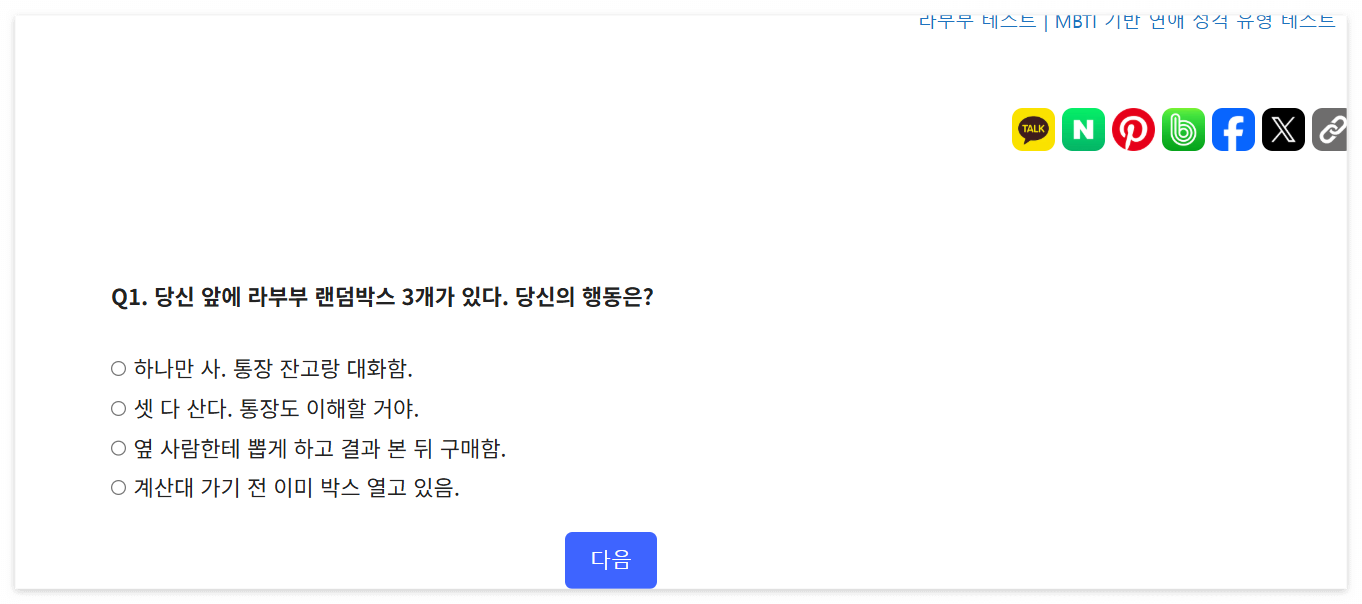 라부부 MBTI 테스트, 해보셨나요? 귀여운 캐릭터로 내 연애 성향을 분석하고, 상대와의 궁합까지 확인할 수 있는 인기 심리테스트입니다. 무료 테스트 링크와 함께 실제 유형별 해석과 사람들의 궁금증까지 총 정리해 드립니다.