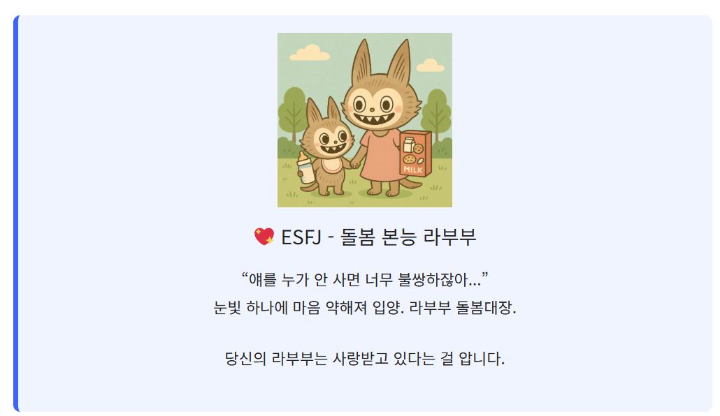 라부부 MBTI는 단순히 MBTI 유형을 보는 것을 넘어, 나와 상대방의 연애 스타일을 감성적으로 시각화해 줍니다. “우리 커플은 어떤 유형일까?” 궁금하다면 지금 바로 테스트해 보세요!