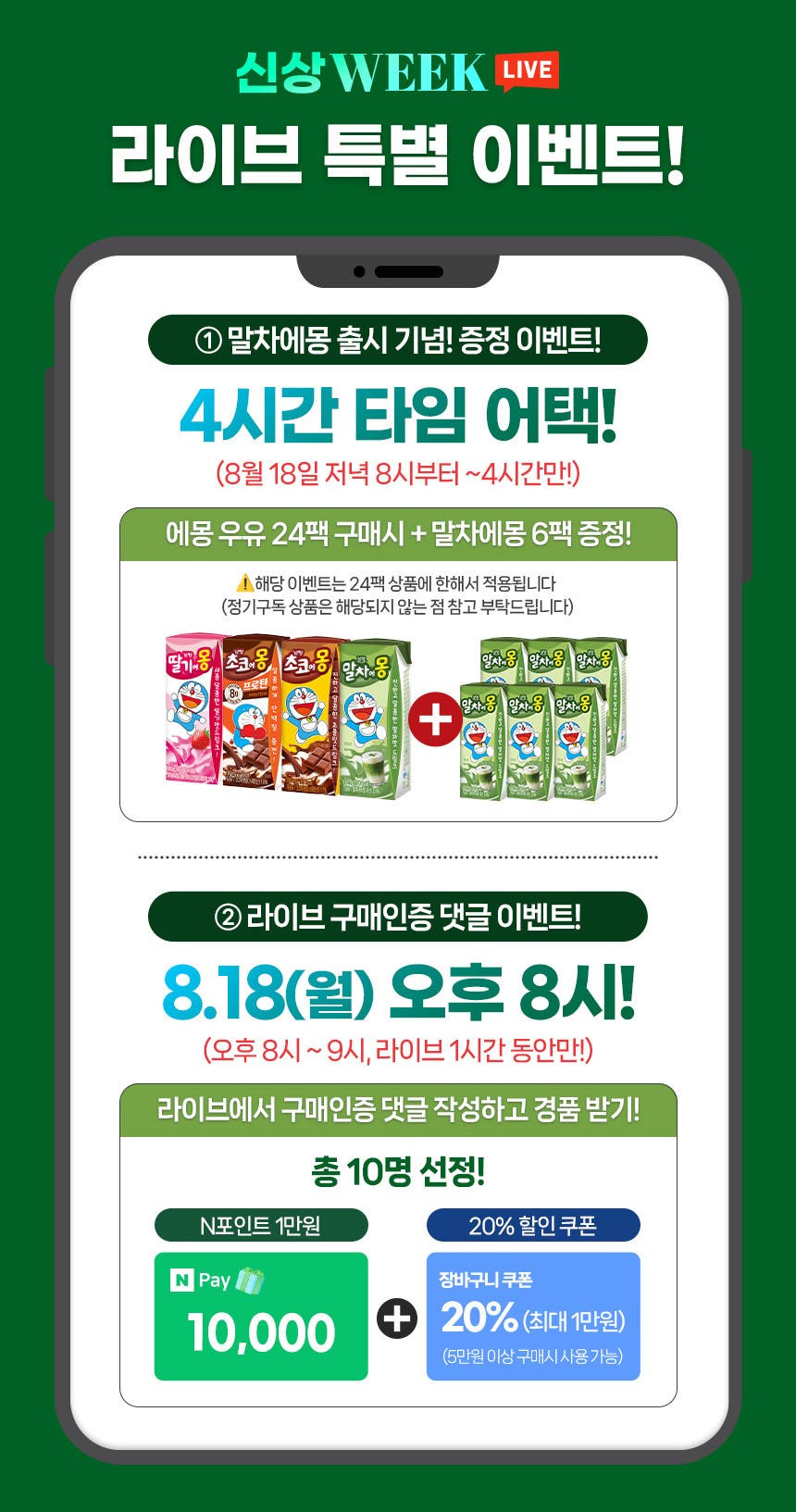 - 혜택: 에몽 우유 24팩 구매 시 → 말차에몽 6팩 증정