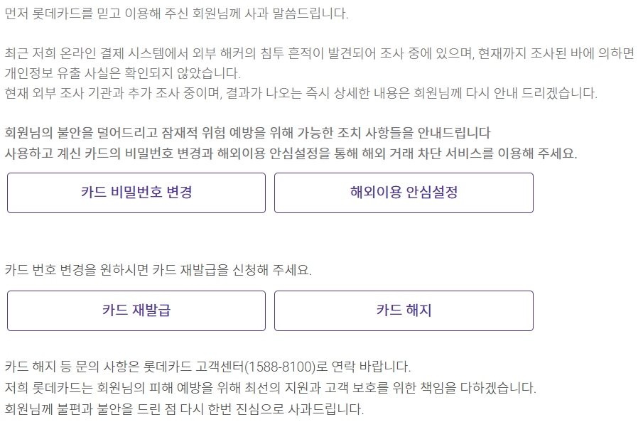 롯데카드 해킹 사건으로 인해 해지 수요가 급증했고, 홈페이지 팝업창을 통한 해지 신청이 대표적 경로가 됐습니다.