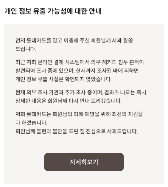 - 롯데카드 홈페이지 접속 시 개인정보 유출 안내 팝업창 → 카드해지 신청 링크 클릭