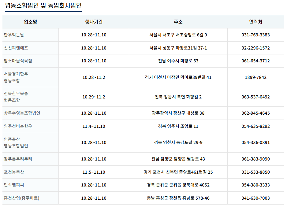 한우 소비를 현지에서 활성화하기 위해 서울·경기·전북·경북·전남 등 전국 각지의 한우조합과 정육점도 함께 참여합니다. 예를 들어 서울경기한우협동조합(이천), 전북한우육종협동조합(정읍), 참푸른우리두리(담양), 홍천산업(홍성) 등 지역 거점별로 할인 행사를 운영합니다. 이들 조합에서는 한우를 직접 가공·판매하기 때문에 가격 경쟁력은 물론, 신선도 면에서도 높은 만족도를 기대할 수 있습니다.
