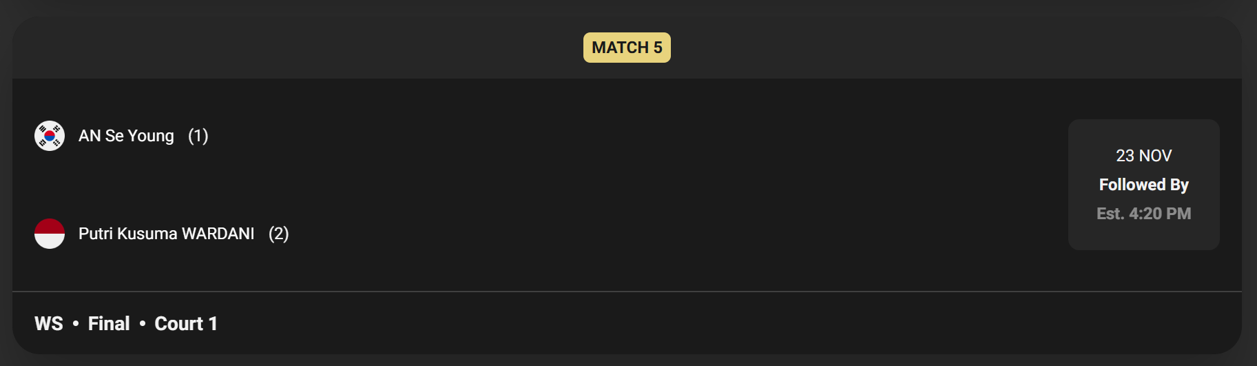 | 4강 | 인타논 | 21-8 21-6 | 배드민턴 클래스 증명 |